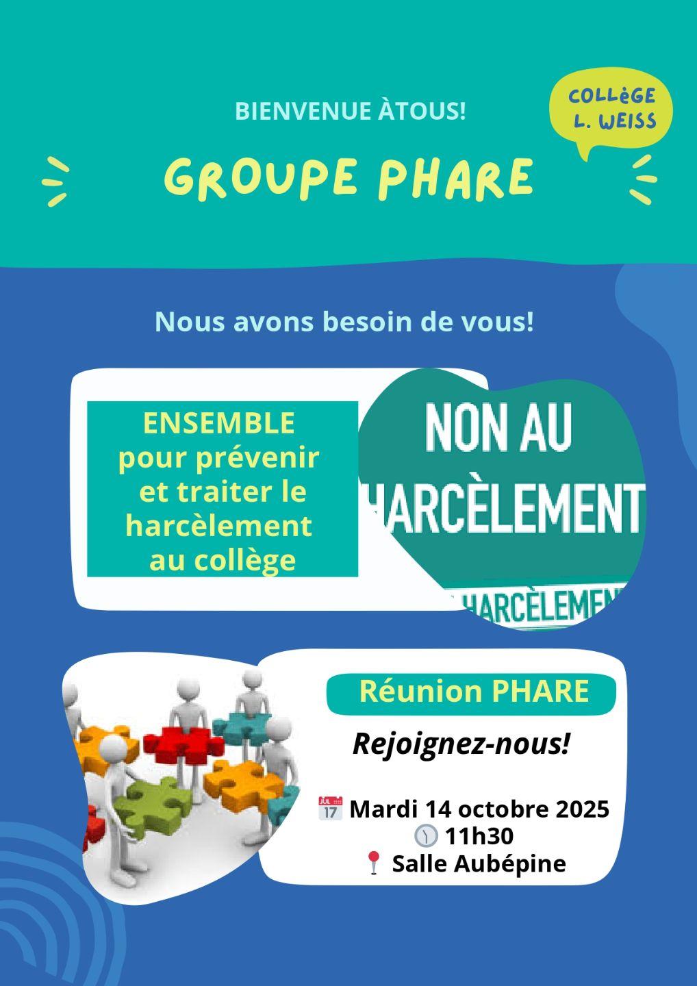 Le groupe PHARE, en charge de la lutte et du traitement du harcèlement au collège, fait sa rentrée et se renforce ! S’UNIR et SE FORMER pour traiter collectivement le harcèlement scolaire demeure notre PRIORITE. Une mise à jour du protocole de (...)