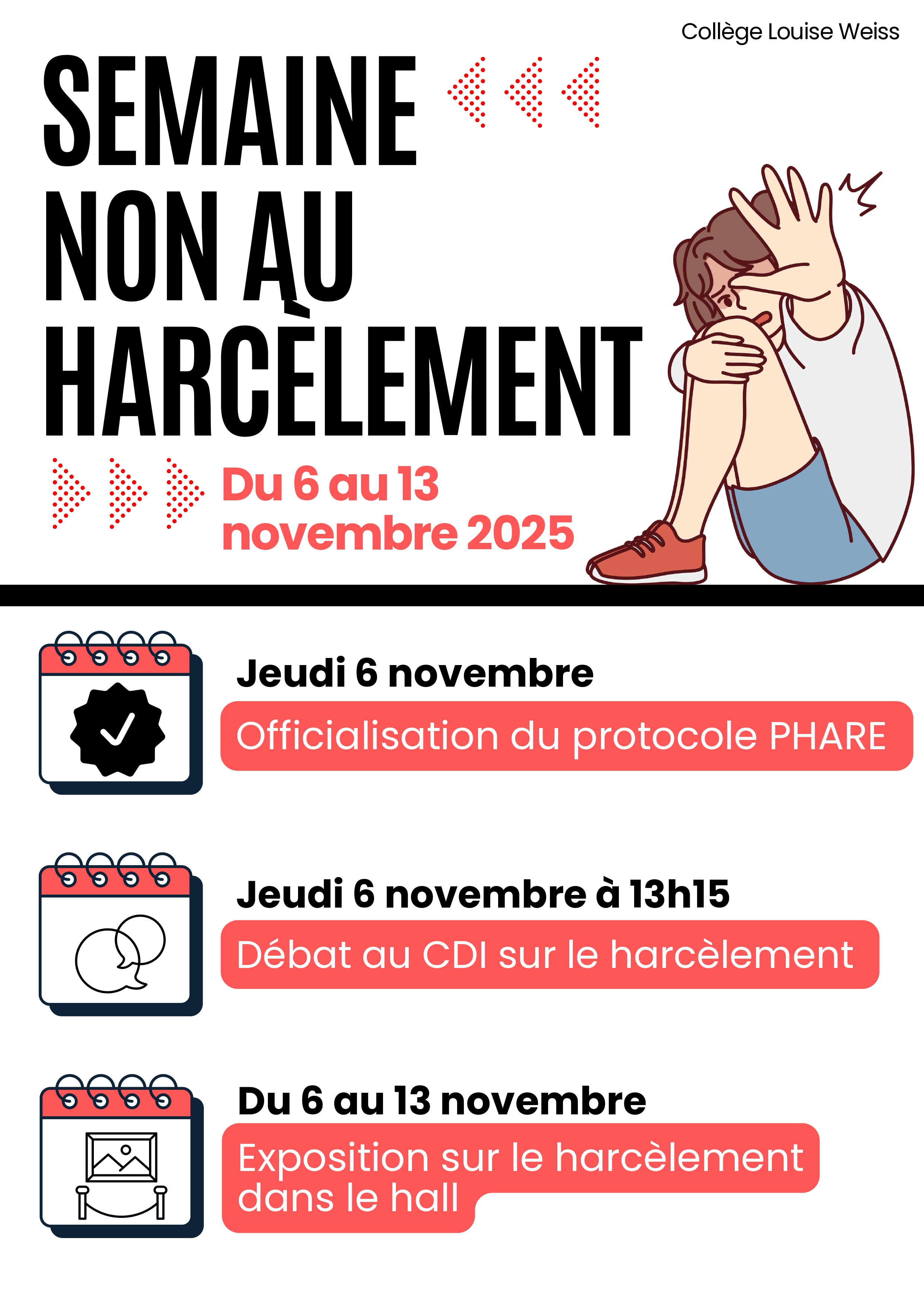Le groupe PHARE du collège Louise WEISS, composé actuellement de 9 membres, propose à la communauté scolaire des actions clés dans le cadre de la journée nationale de lutte contre le harcèlement scolaire du 06 novembre 2025. Retrouvez l’ensemble des (...)